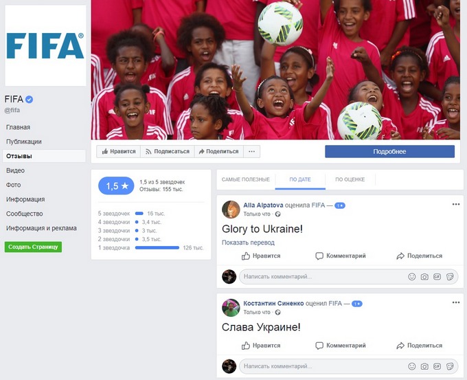 ###Украинцы обвалили рейтинг официальной страницы ФИФА в Facebook ###